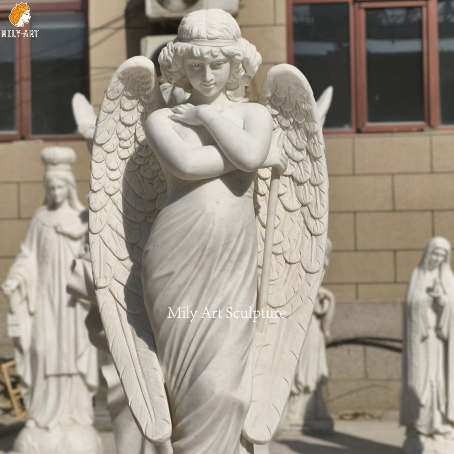 <<The marble big Angel statue features exquisite details, exuding a sense of tranquility and sacredness. The angel stands in an elegant posture, adorned with a flowing long dress.