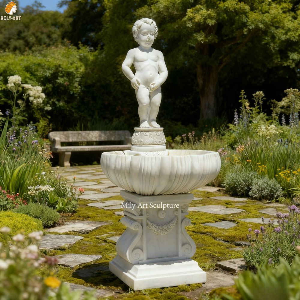 The marble fountain features a standing cherub peeing. It’s humorous, compact, and exquisite, creating a lighthearted and delightful visual experience.