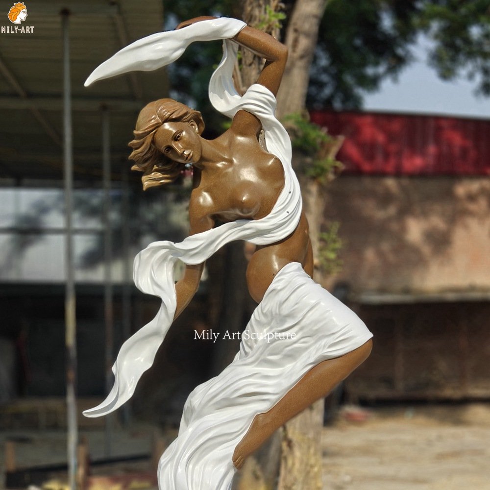 >>The large bronze dancing lady sculpture depicts the dancer’s body in a graceful S-curve, with both feet dangling in the air, one in front and one behind. She smiles, her head slightly tilted back, her hair flowing with her movements, her expression focused and joyful, as if immersed in the expression of the music.
