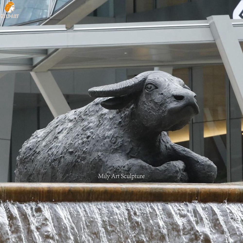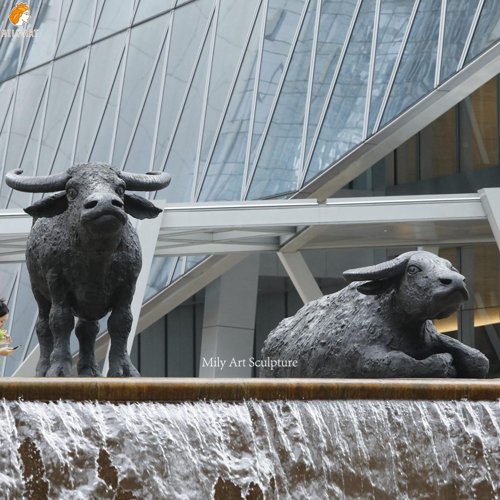 >>Two buffalo are depicted, one standing and one lying down. The standing buffalo holds its head high, displaying a composed posture; the lying buffalo appears relaxed and at ease, capturing the natural form of the buffalo. The sculpture’s surface features a rough texture (simulating the skin texture of buffalo) and a deep black color.