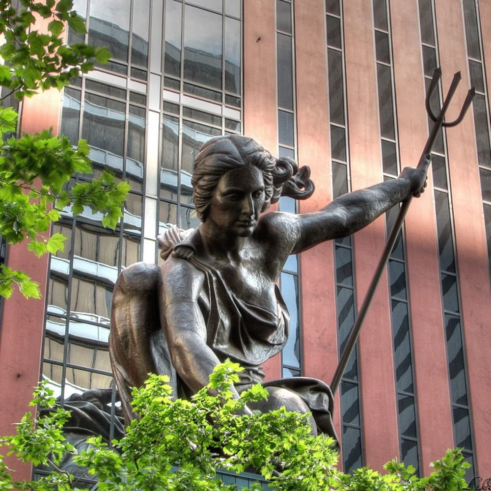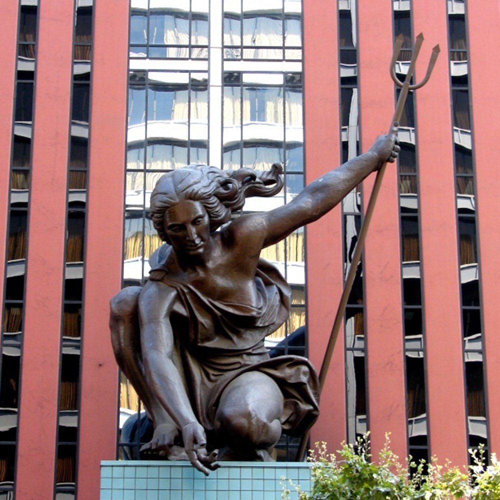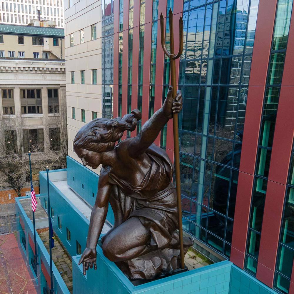 >>The statue is 25 feet (approximately 7.6 meters) tall, depicting a kneeling female figure with her right hand raised, holding a trident. It is inspired by the “Lady of Commerce” from the 1878 Portland city seal – symbolizing the city’s agriculture, industry, shipping, and natural resources. Her left hand is extended forward, she wears a flowing robe, and her hair is blown to one side. Her kneeling posture does not signify weakness, but rather expresses protection and attentiveness to the city.