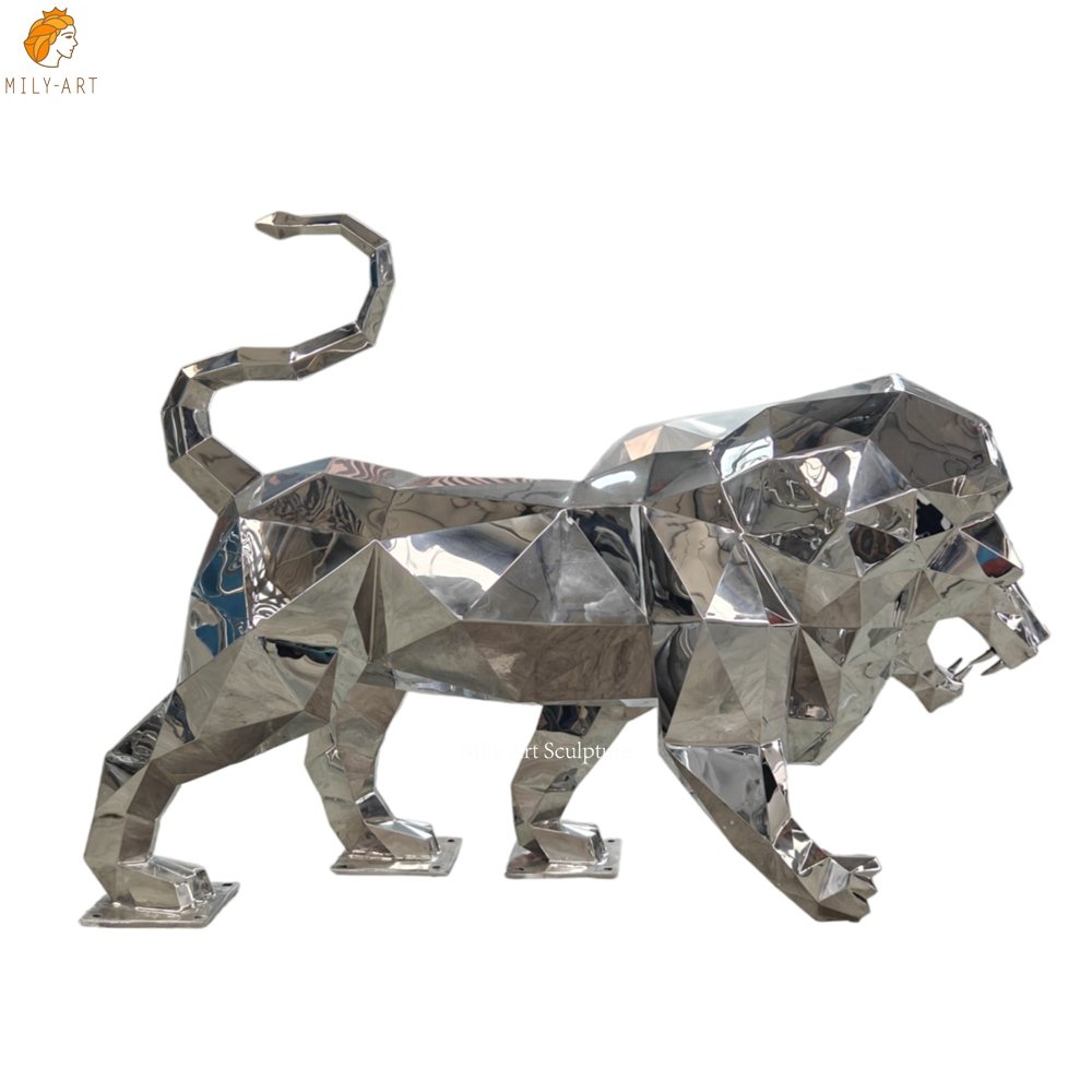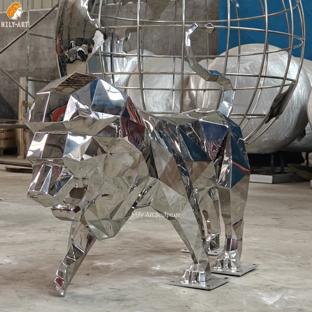 <<The stainless steel sculpture seamlessly blends the majestic dignity of the traditional lion with modern geometric aesthetics, embodying both cultural significance and contemporary design feelings.