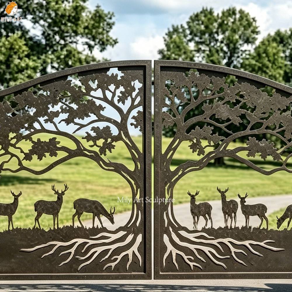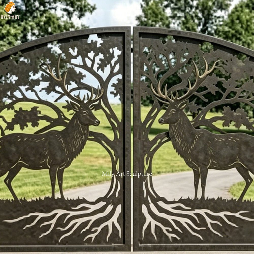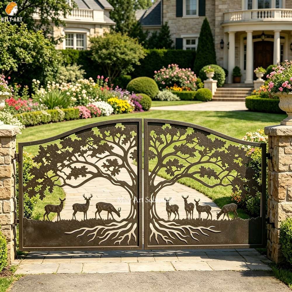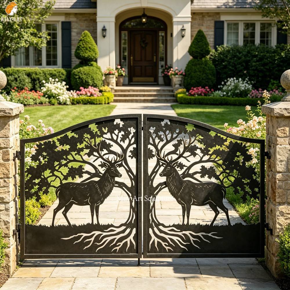 >>Inspired by North American rustic aesthetics, this entrance iron gate seamlessly integrates elements of forest landscapes and wild deer into its design. It harmonizes beautifully with natural surroundings and also carries auspicious symbolism associated with guardianship and good fortune.