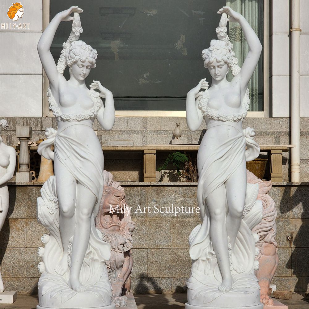 >>Besides outdoor use, this marble Nymph statue is also suitable for indoor spaces such as hotel lobbies and upscale club lounges. Of course, if you would like to learn more about other styles of marble female statues, you could contact us directly to obtain a complete catalog for free.