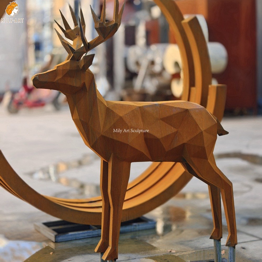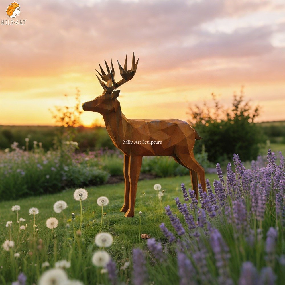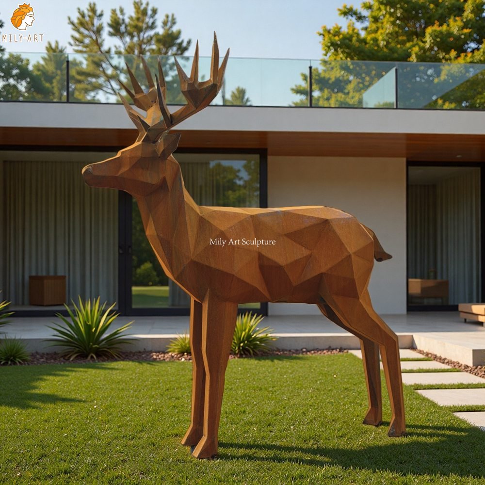 The corten steel reindeer sculpture features a sharply defined polygonal shape, giving it a unique reddish-brown appearance, making it ideal for private gardens, villa courtyards, guesthouse yards, and city parks.