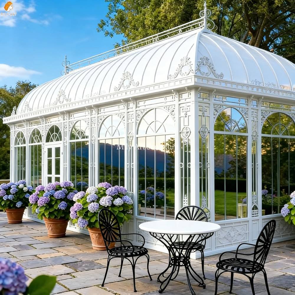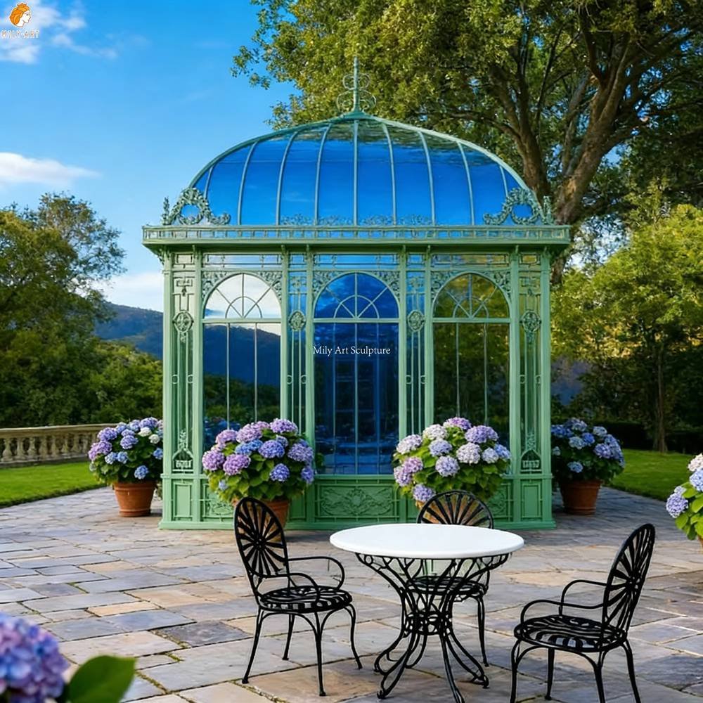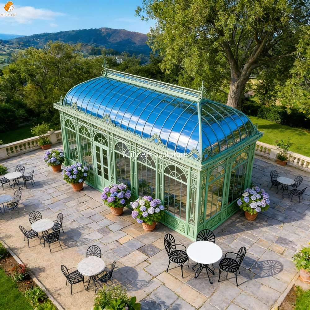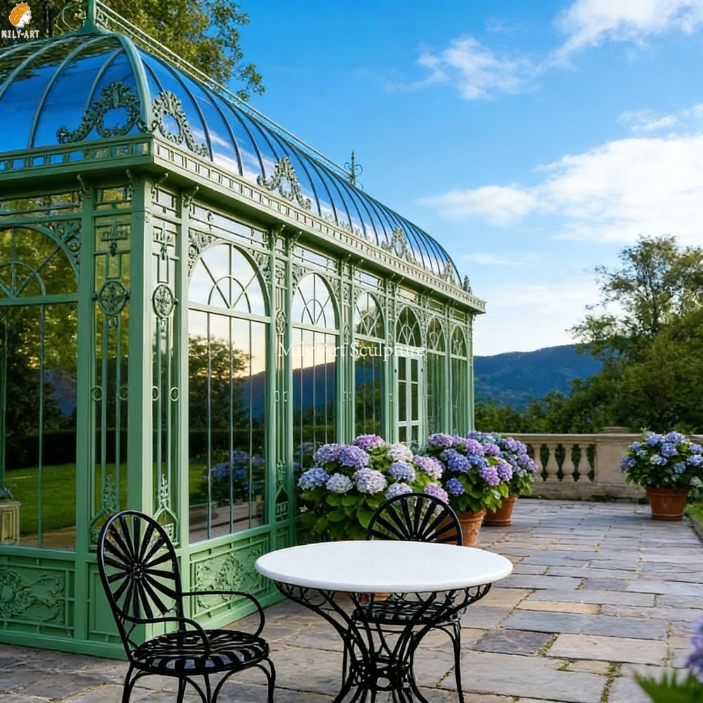 The iron conservatory features a bright, refreshing mint-green hue—an elegant and refined aesthetic that makes it the perfect focal point for any outdoor setting. With superior quality and exquisite craftsmanship, it is built to withstand even extreme climatic conditions.
