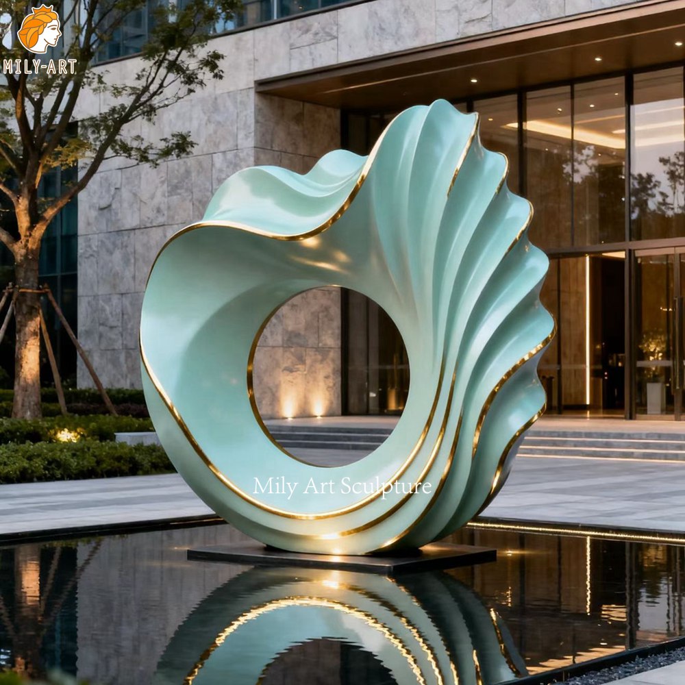 <<The green metal water feature sculpture features a circular structure with undulating, twisting lines that create a dynamic “flowing ring” shape. This breaks away from the rigidity of conventional geometric shapes, exuding rhythm and tension.