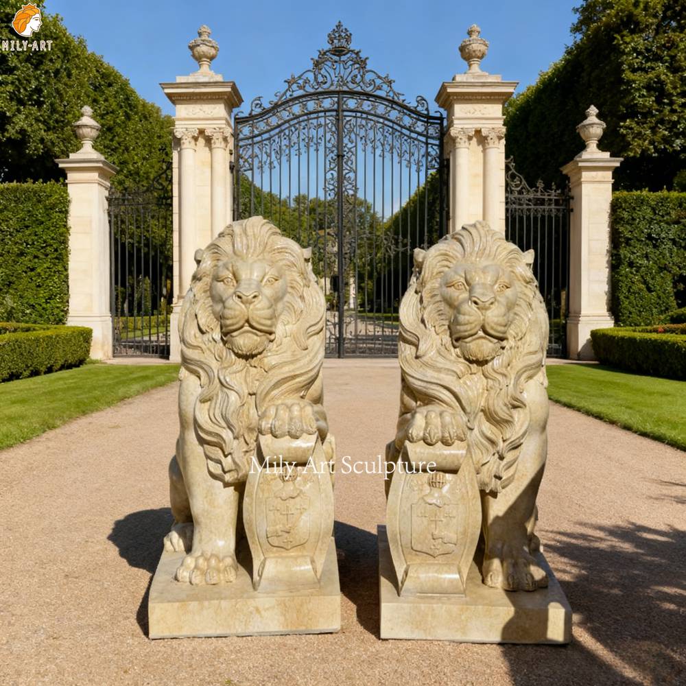 These beige marble lion statues with shields symbolize protection, authority, and power, as well as status and prestige. Their classic and elegant style makes them suitable for framing villa entrances, high-end hotel entrances, and decorating European-style manor houses and courtyards.