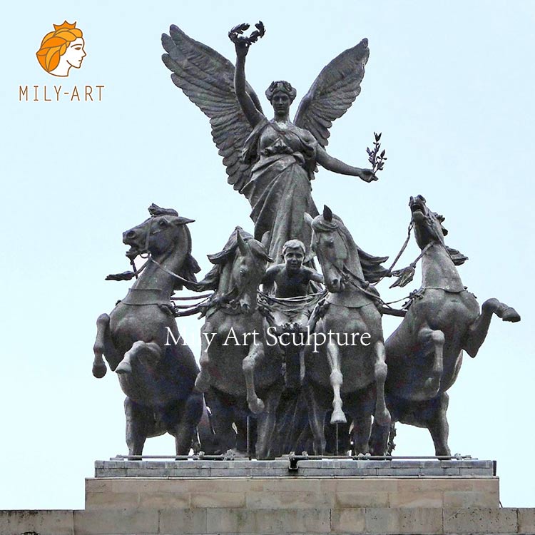 >> This large bronze chariot and horses sculpture, also called “The Quadriga of Victory”, must leave a deep impression at first sight. The four horses draw a large chariot and Victoria who is the Roman goddess of Victory drives the chariot. All of them are lifelike and extremely close to the original design.