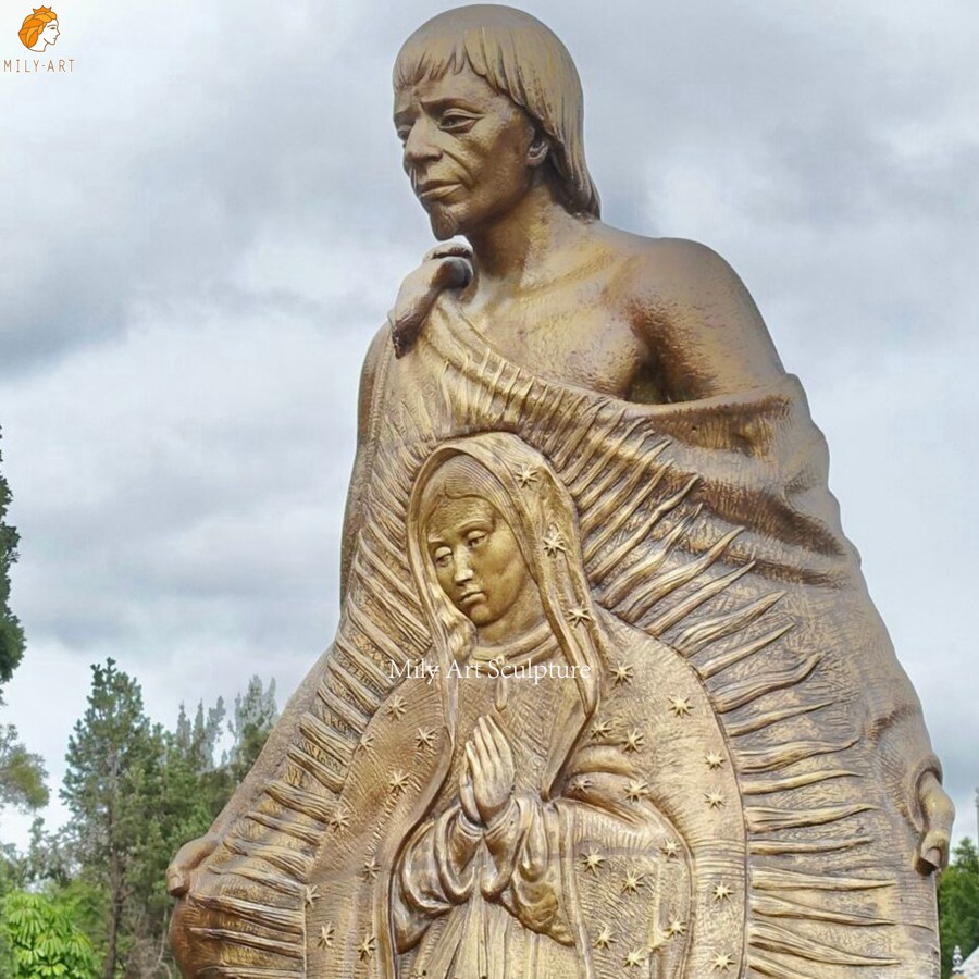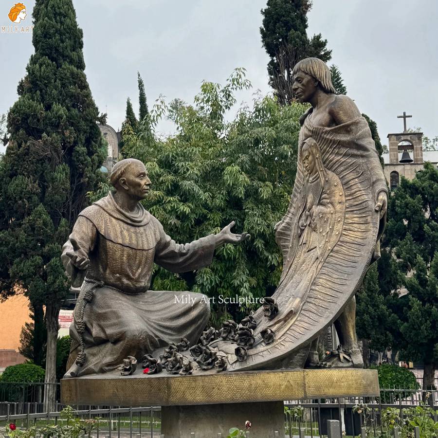 The bronze Guadalupe and St. Juan Diego sculpture symbolizes Catholic faith, cultural integration, Mexican national identity, and hope and comfort. Available for worldwide shipping and factory direct.