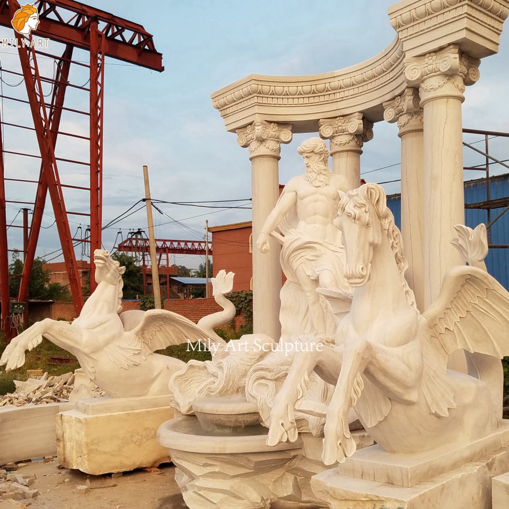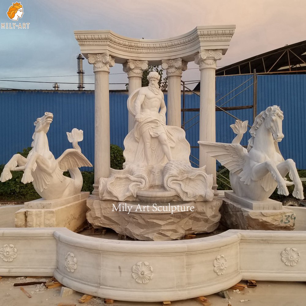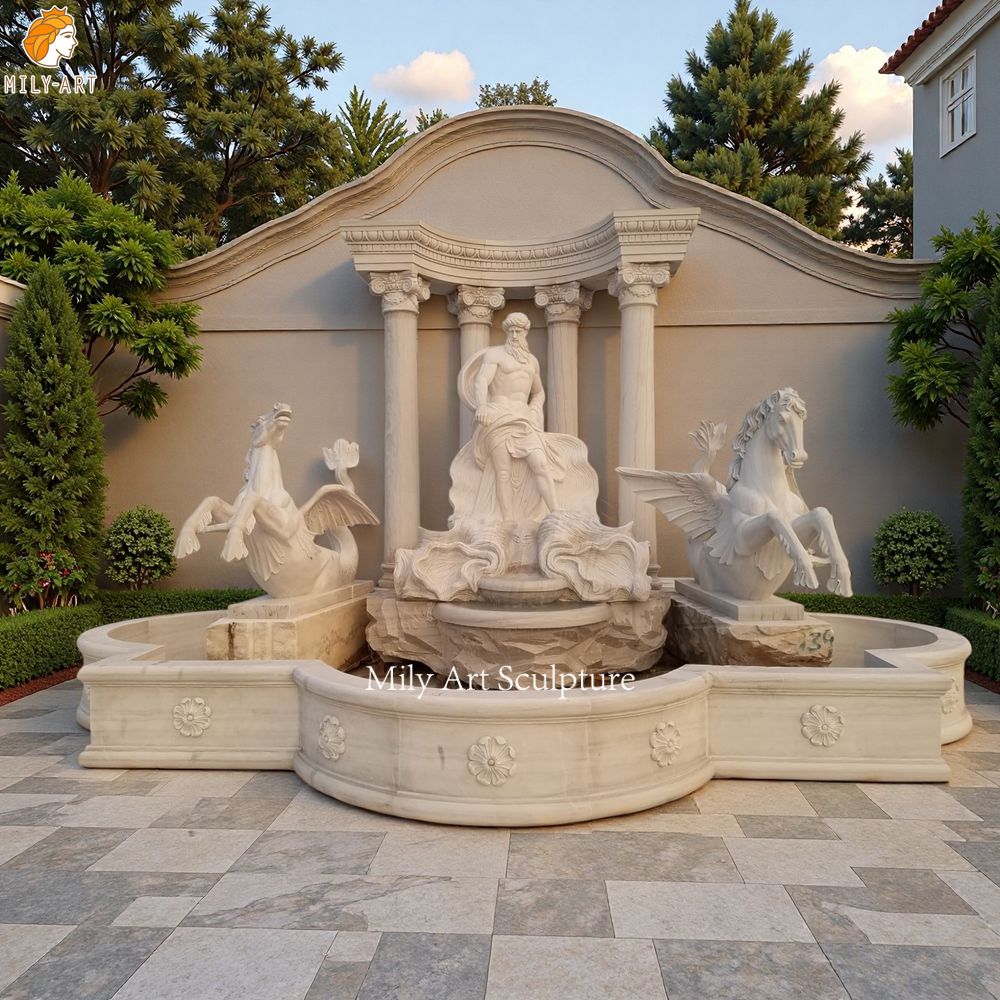 <<The small marble trevi fountain replica is hand-carved from white marble. Behind it is a group of Roman-columned pavilions, with a standing Poseidon and two seahorses in different poses in the center. In front is a circular fountain pool adorned with flowers.