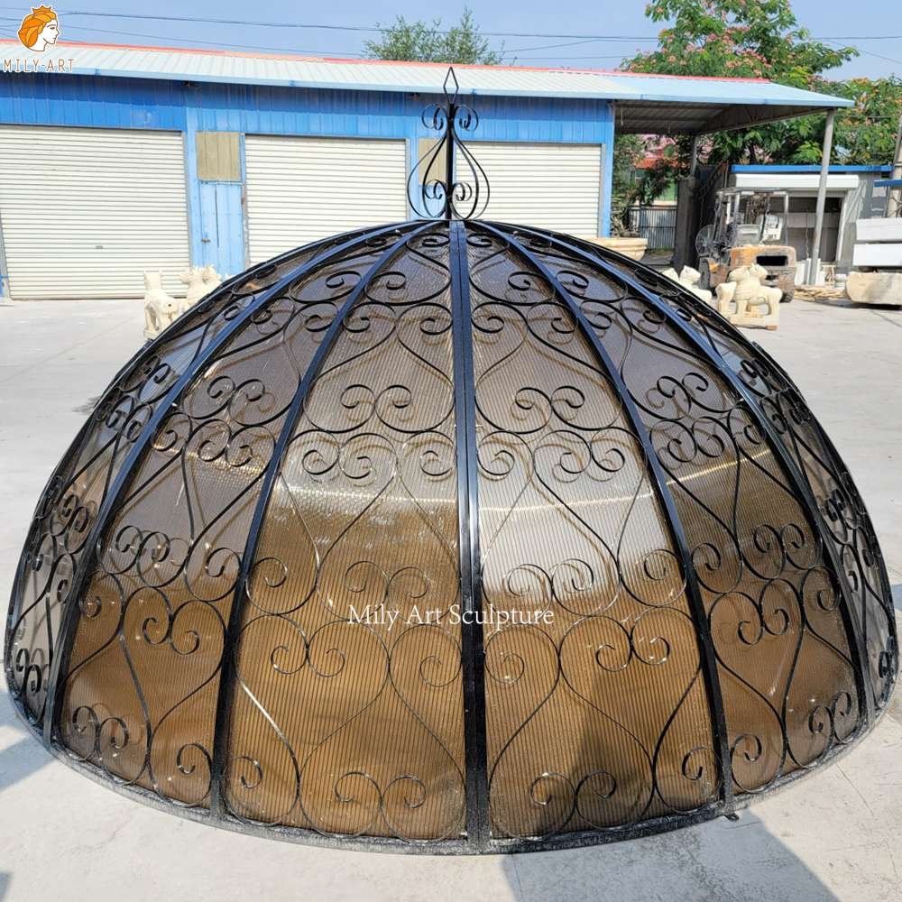 >>The roof is a dome-shaped design, crafted from black wrought iron, covered with intricate swirling patterns and geometric decorations, creating a magnificent openwork artistic effect. A pointed finial adorns the center of the dome, adding to the overall verticality and visual focus. The dome’s glass allows light to pass through, casting dappled shadows through the glass and carvings, creating a dreamlike atmosphere.